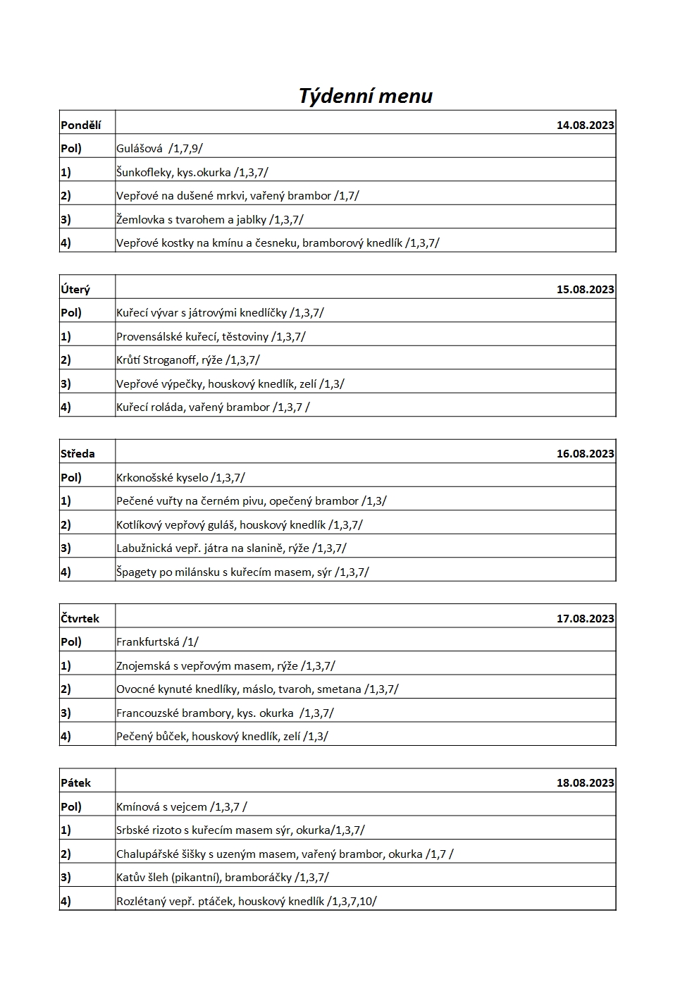 | 4) | Špekové knedlíky, zelí, cibulka /1,3,7/ |